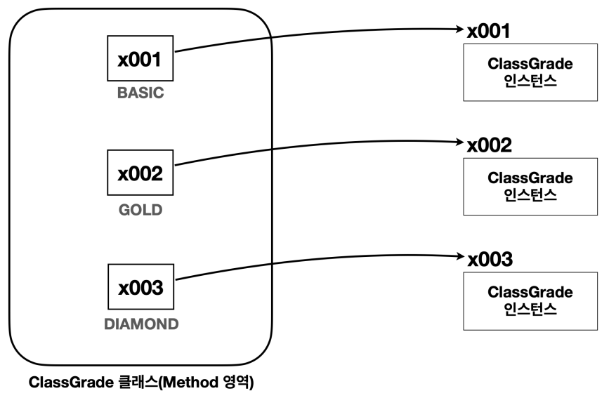 - 각각의 상수는 모두 서로 각각 다른 `ClassGrade` 인스턴스를 참조하기 때문에 참조값이 다르게 출력된다.